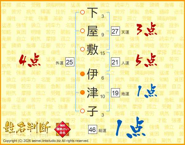 下屋敷伊津子さんの総運は46画の1点!