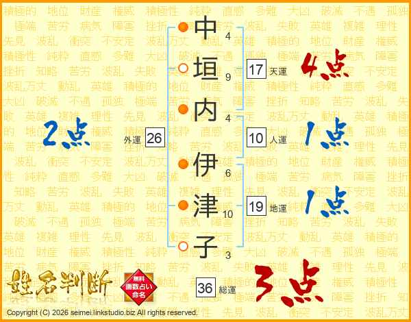 中(4画)垣(9画)内(4画) 伊(6画)津(10画)子(3画)