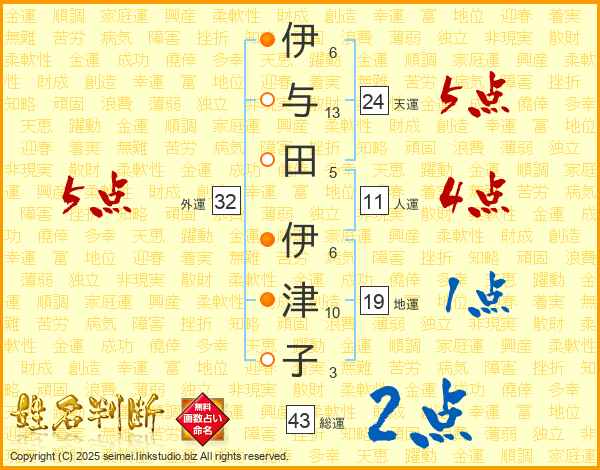 伊(6画)与(13画)田(5画) 伊(6画)津(10画)子(3画)