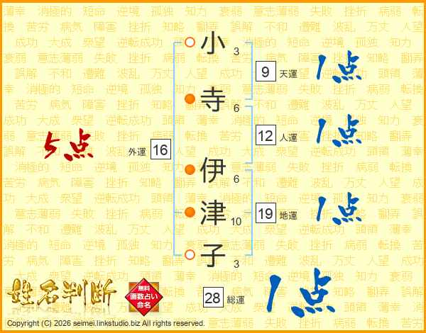小(3画)寺(6画) 伊(6画)津(10画)子(3画)