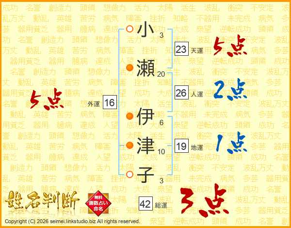 小(3画)瀬(20画) 伊(6画)津(10画)子(3画)