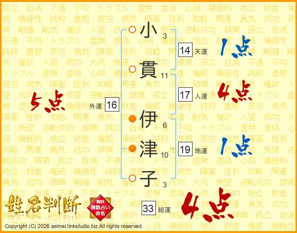 小(3画)貫(11画) 伊(6画)津(10画)子(3画)