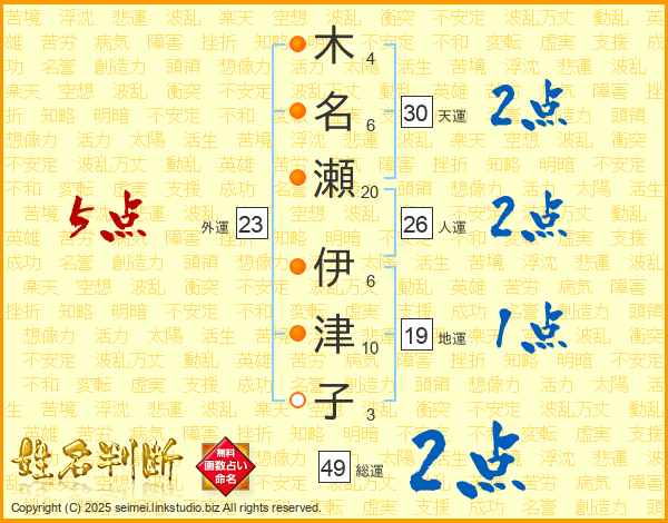 木(4画)名(6画)瀬(20画) 伊(6画)津(10画)子(3画)