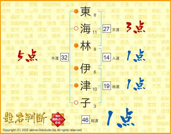 東(8画)海(11画)林(8画) 伊(6画)津(10画)子(3画)