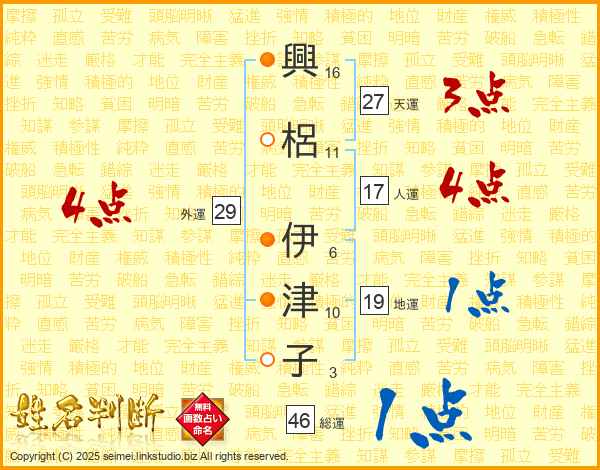 興(16画)梠(11画) 伊(6画)津(10画)子(3画)