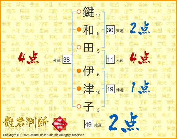 鍵(17画)和(8画)田(5画) 伊(6画)津(10画)子(3画)