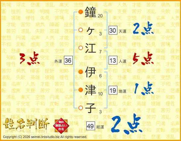 鐘ヶ江伊津子さんの総運は49画の2点!