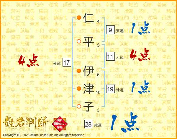 仁(4画)平(5画) 伊(6画)津(10画)子(3画)