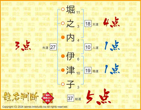 堀(11画)之(3画)内(4画) 伊(6画)津(10画)子(3画)