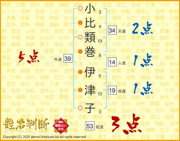 小(3画)比(4画)類(19画)巻(8画) 伊(6画)津(10画)子(3画)