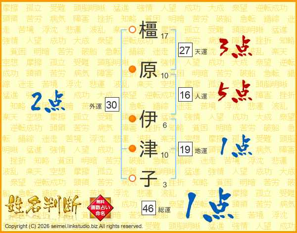 橿(17画)原(10画) 伊(6画)津(10画)子(3画)