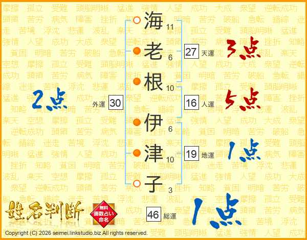 海(11画)老(6画)根(10画) 伊(6画)津(10画)子(3画)