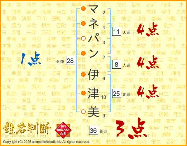 マ(2画)ネ(4画)パ(3画)ン(2画) 伊(6画)津(10画)美(9画)