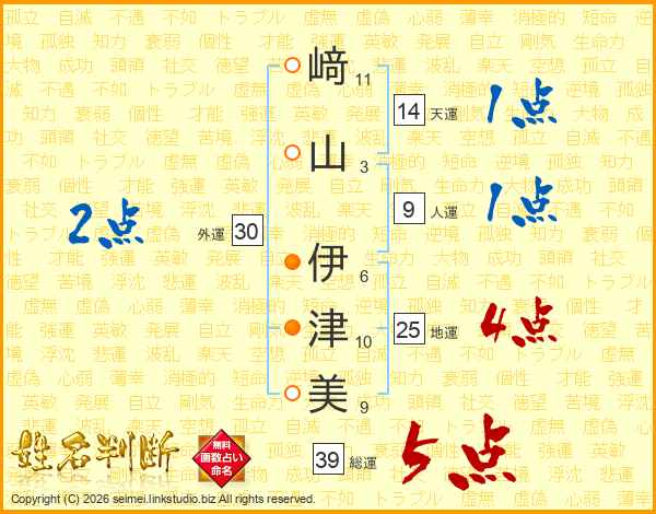 﨑(11画)山(3画) 伊(6画)津(10画)美(9画)