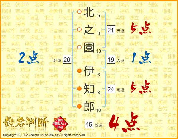 北(5画)之(3画)園(13画) 伊(6画)知(8画)郎(10画)