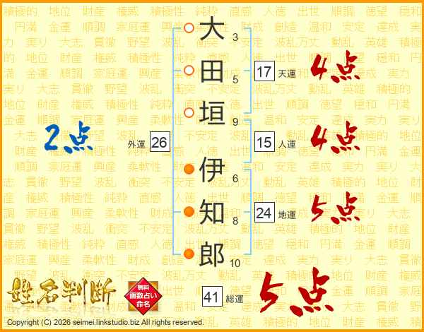 大(3画)田(5画)垣(9画) 伊(6画)知(8画)郎(10画)