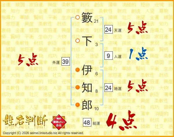 籔(21画)下(3画) 伊(6画)知(8画)郎(10画)