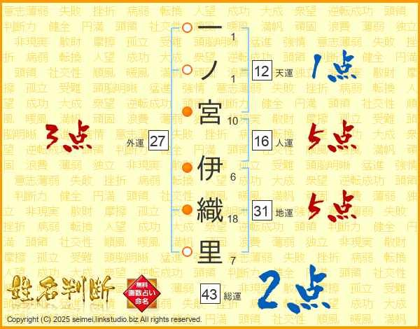 一(1画)ノ(1画)宮(10画) 伊(6画)織(18画)里(7画)