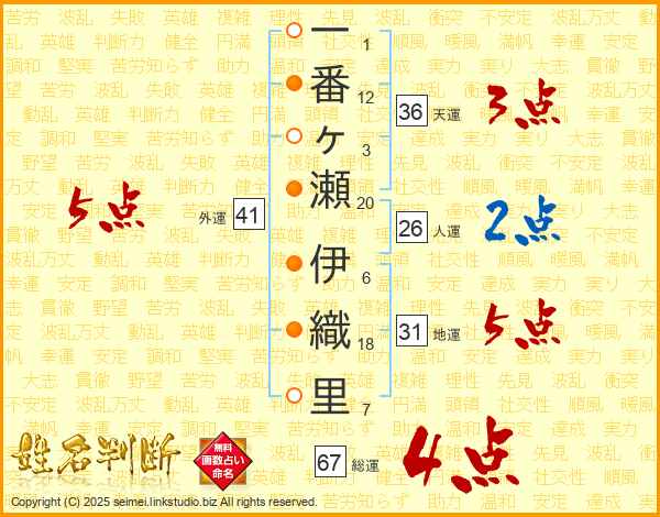 一番ヶ瀬伊織里さんの総運は67画の4点!