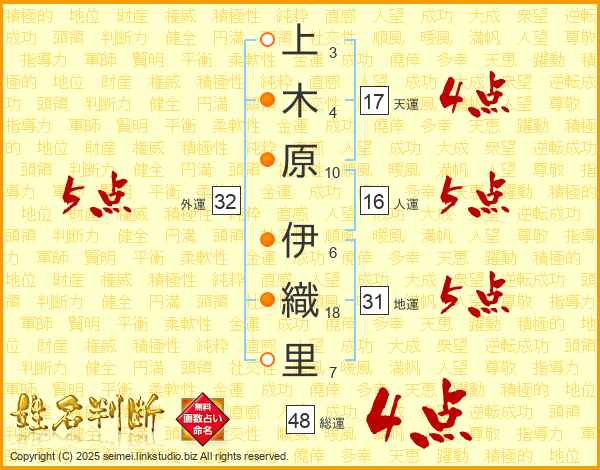上(3画)木(4画)原(10画)  伊(6画)織(18画)里(7画)
