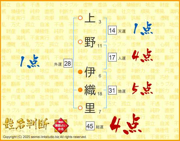 上(3画)野(11画) 伊(6画)織(18画)里(7画)