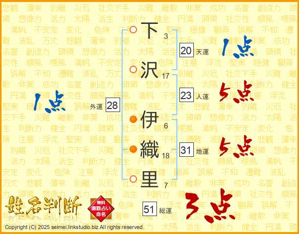 下(3画)沢(17画) 伊(6画)織(18画)里(7画)