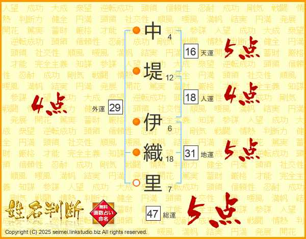 中(4画)堤(12画) 伊(6画)織(18画)里(7画)