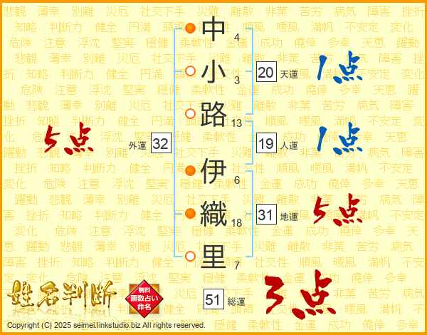 中(4画)小(3画)路(13画) 伊(6画)織(18画)里(7画)
