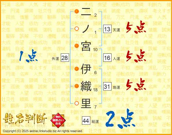 二(2画)ノ(1画)宮(10画) 伊(6画)織(18画)里(7画)