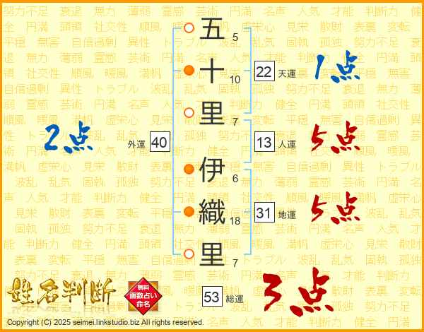 五十里伊織里さんの地運は31画の5点