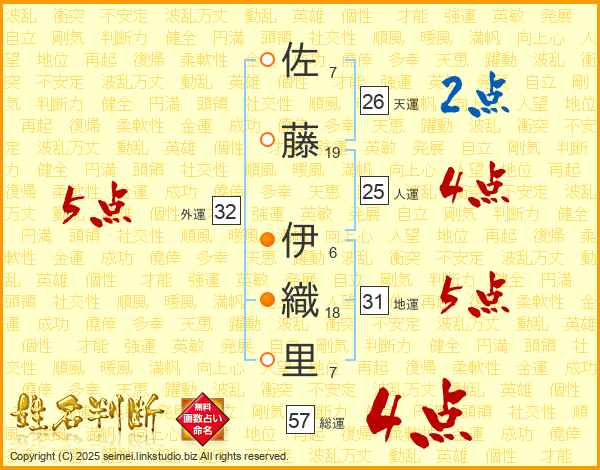 佐藤伊織里さんの総運は57画の4点