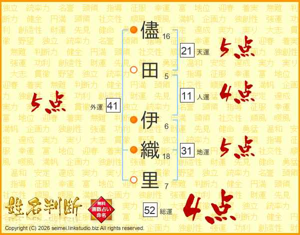 儘田伊織里さんの総運は52画の4点!