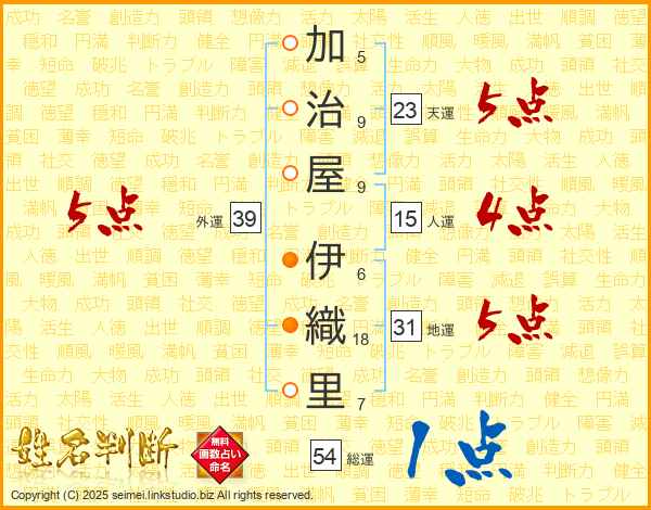 加(5画)治(9画)屋(9画) 伊(6画)織(18画)里(7画)