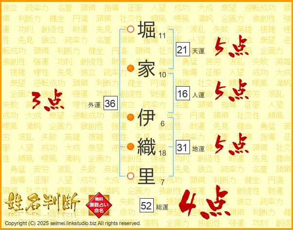 堀(11画)家(10画) 伊(6画)織(18画)里(7画)