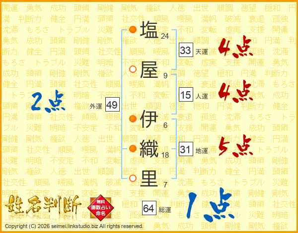 塩屋伊織里さんの総運は64画の1点!