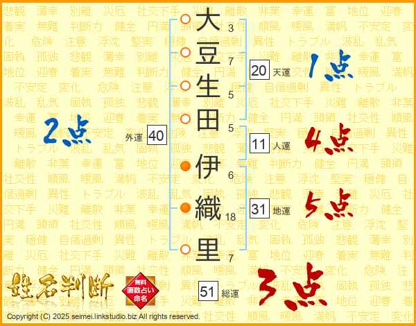 大豆生田伊織里さんの総運は51画の3点