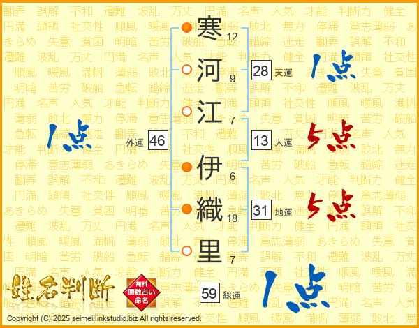 寒(12画)河(9画)江(7画) 伊(6画)織(18画)里(7画)