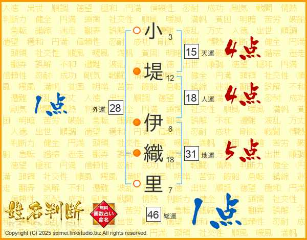 小(3画)堤(12画) 伊(6画)織(18画)里(7画)