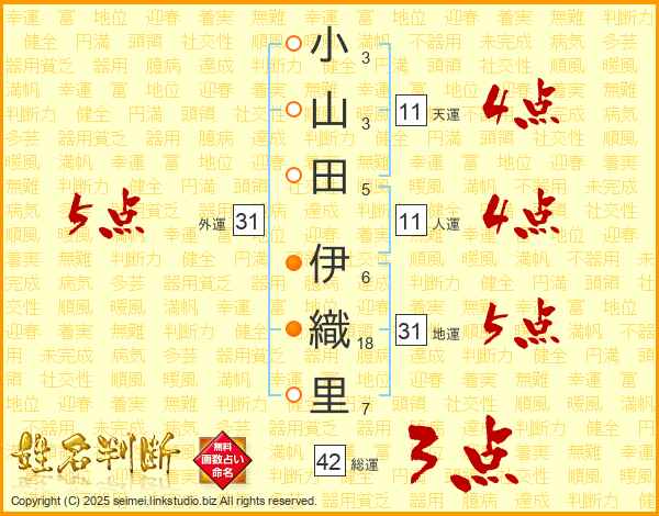 小(3画)山(3画)田(5画) 伊(6画)織(18画)里(7画)
