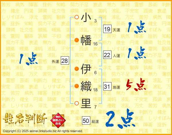 小(3画)幡(16画) 伊(6画)織(18画)里(7画)
