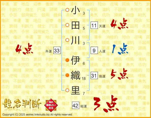 小(3画)田(5画)川(3画) 伊(6画)織(18画)里(7画)