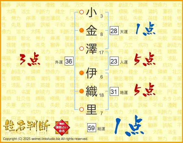 小(3画)金(8画)澤(17画) 伊(6画)織(18画)里(7画)