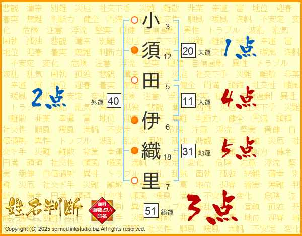 小(3画)須(12画)田(5画) 伊(6画)織(18画)里(7画)