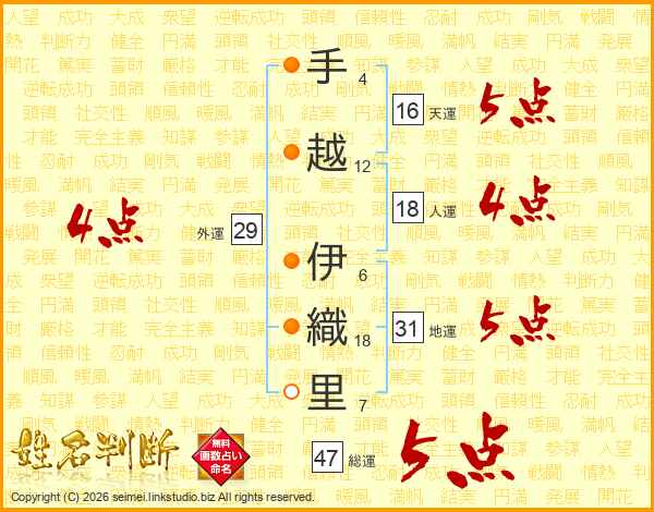 手越伊織里さんの総運は47画の5点!