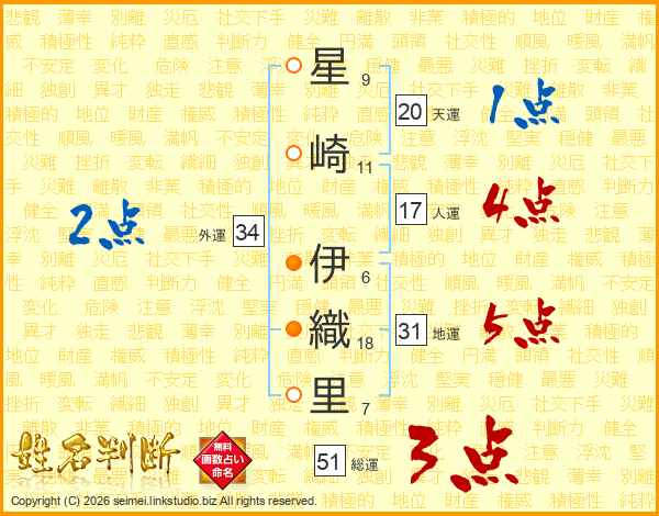 星(9画)崎(11画) 伊(6画)織(18画)里(7画)