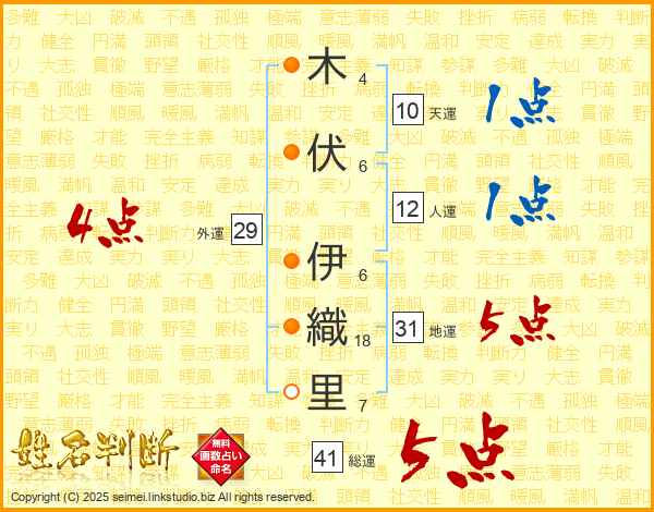 木(4画)伏(6画) 伊(6画)織(18画)里(7画)