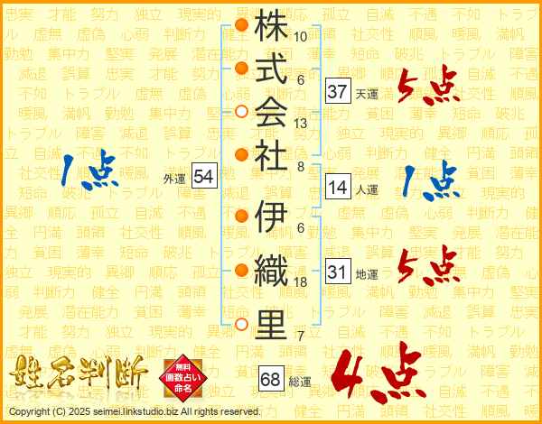 株(10画)式(6画)会(13画)社(8画) 伊(6画)織(18画)里(7画)