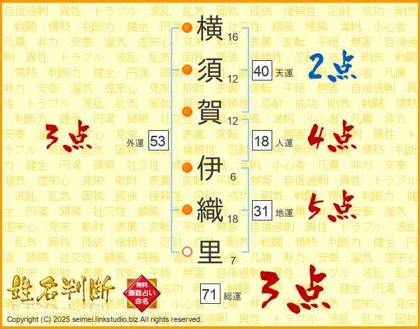 横(16画)須(12画)賀(12画) 伊(6画)織(18画)里(7画)