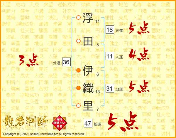 浮(11画)田(5画)  伊(6画)織(18画)里(7画)