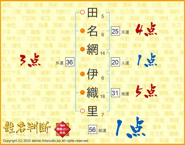田(5画)名(6画)網(14画)  伊(6画)織(18画)里(7画)